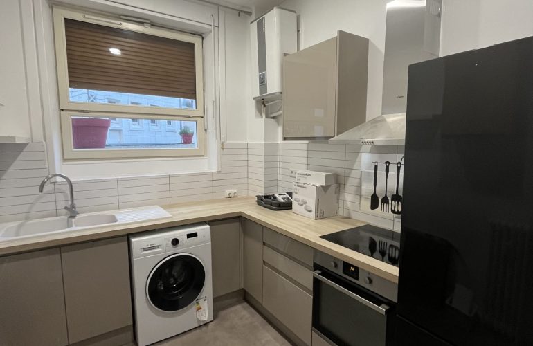 Chambre meublée disponible en colocation dans un logement comprenant une cuisine entièrement équipée (lave-linge, plaques de cuisson, hotte, four, réfrigérateur), un séjour ainsi qu’une salle d’eau.