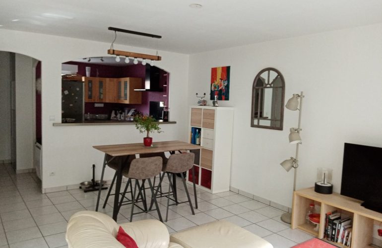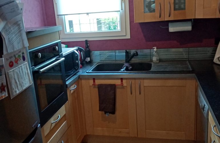 La colocation comprend un espace séjour, une cuisine totalement aménagée et équipée, un jardin et une partie terrasse.
