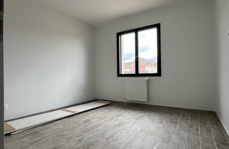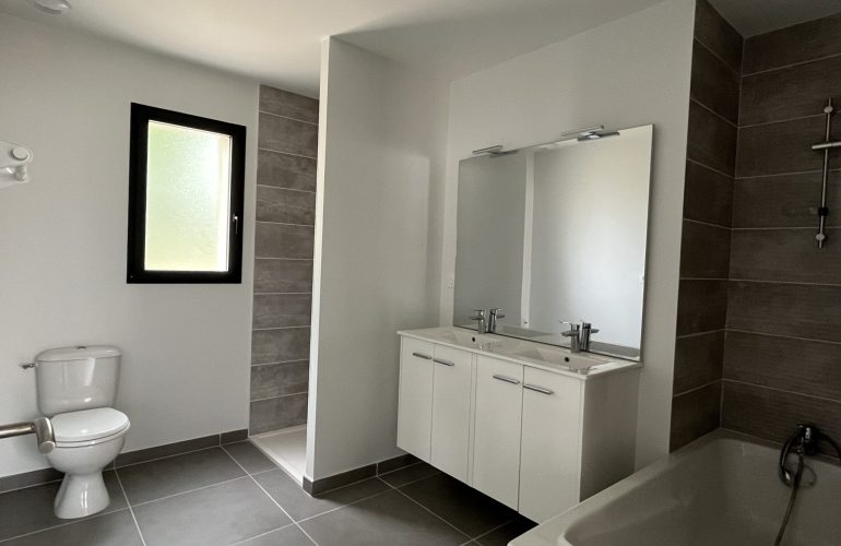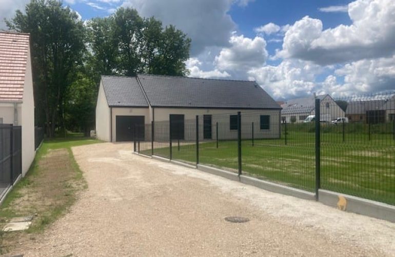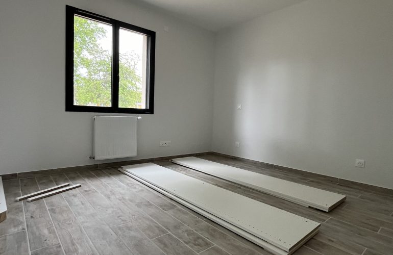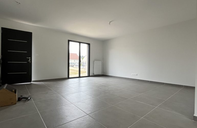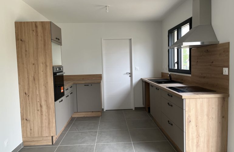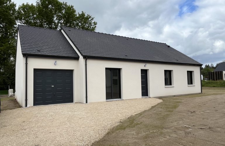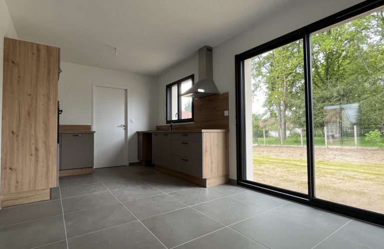 Vouzon, maison individuelle F4, neuve (RT 2020), de plain pied, de 102,60 m2, comprenant : une entrée avec placard, un séjour (34 m2), une cuisine semi ouverte aménagée et équipée (plaque à induction, four électrique et hotte), un cellier, un dégagement, trois chambres (carrelées au sol) dont 2 avec placard, un wc, une salle de bains avec douche et baignoire. Un garage (17 m2). Un grand terrain de 1200 m2 (non clos sur l’entrée). Chauffage et eau chaude avec pompe à chaleur air-eau. Disponible le 1er avril